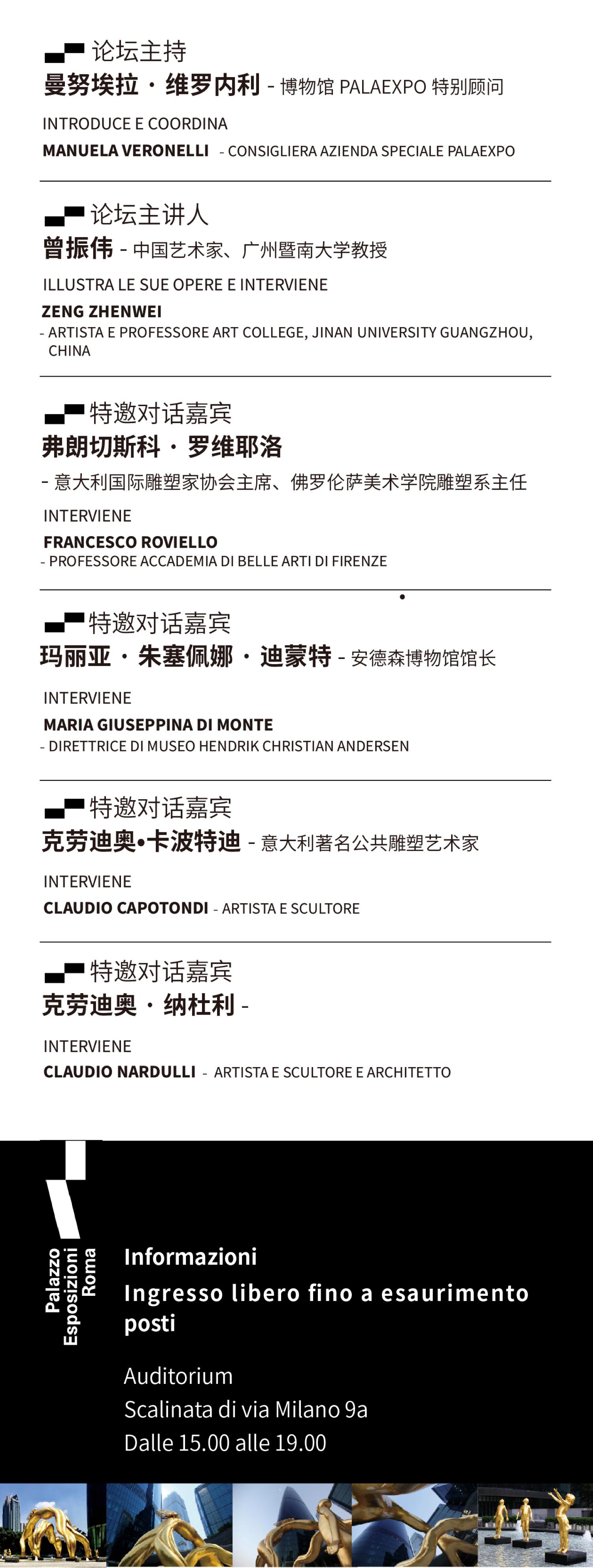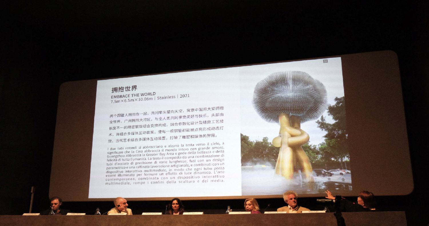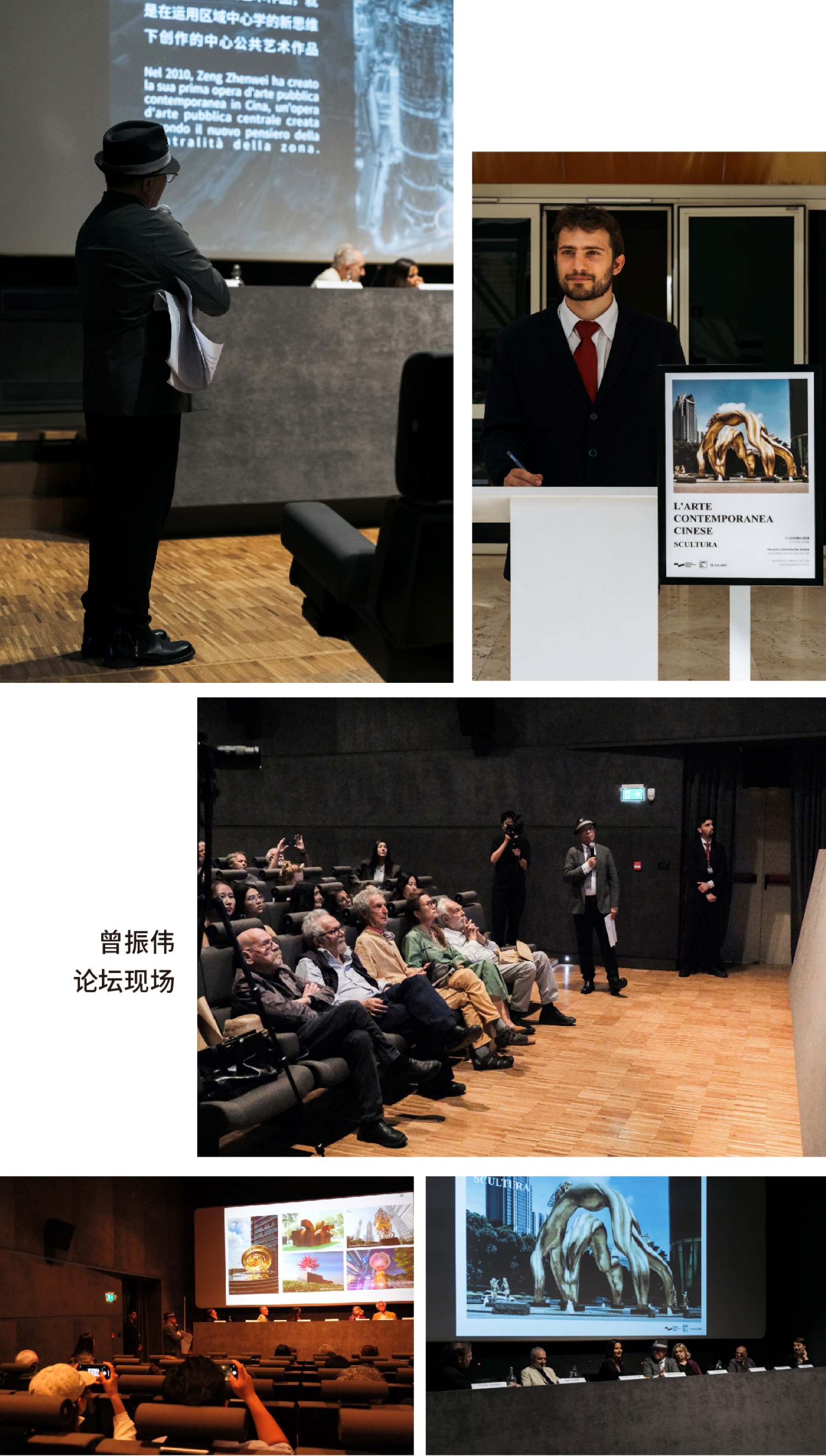 2024年6月11日,中国当代艺术家曾振伟受邀在意大利罗马展览宫举办学术论坛,对中西方当代雕塑不同维度的学术观念与意大利艺术评论家、策展人和著名艺术家等专家组成员进行了深入的艺术探讨和文化交流,并发表主题学术演讲《 初探中国当代雕塑的公共性格与传统美学交替演绎模式 》。从古雅典文明公共空间文化载体的历史脉络发展至当代艺术范畴下的雕塑艺术的公共性格,曾振伟结合意大利文艺复兴运动和中国南北朝时期的文化繁荣与大融合的艺术美学对比,分享了自身多年艺术创作所总结提炼的区域中心学思维理论。对其自2009年至今,为中国广州城市中心创作的众多大型城市公共艺术案例进行深度解读,其学术观和当代艺术作品获得意大利专家团队的高度赞誉,本次论坛被认为是提供了一个跨文化对话和艺术鉴赏的平台,促进两种伟大传统艺术文化之间深刻而丰富的碰撞。