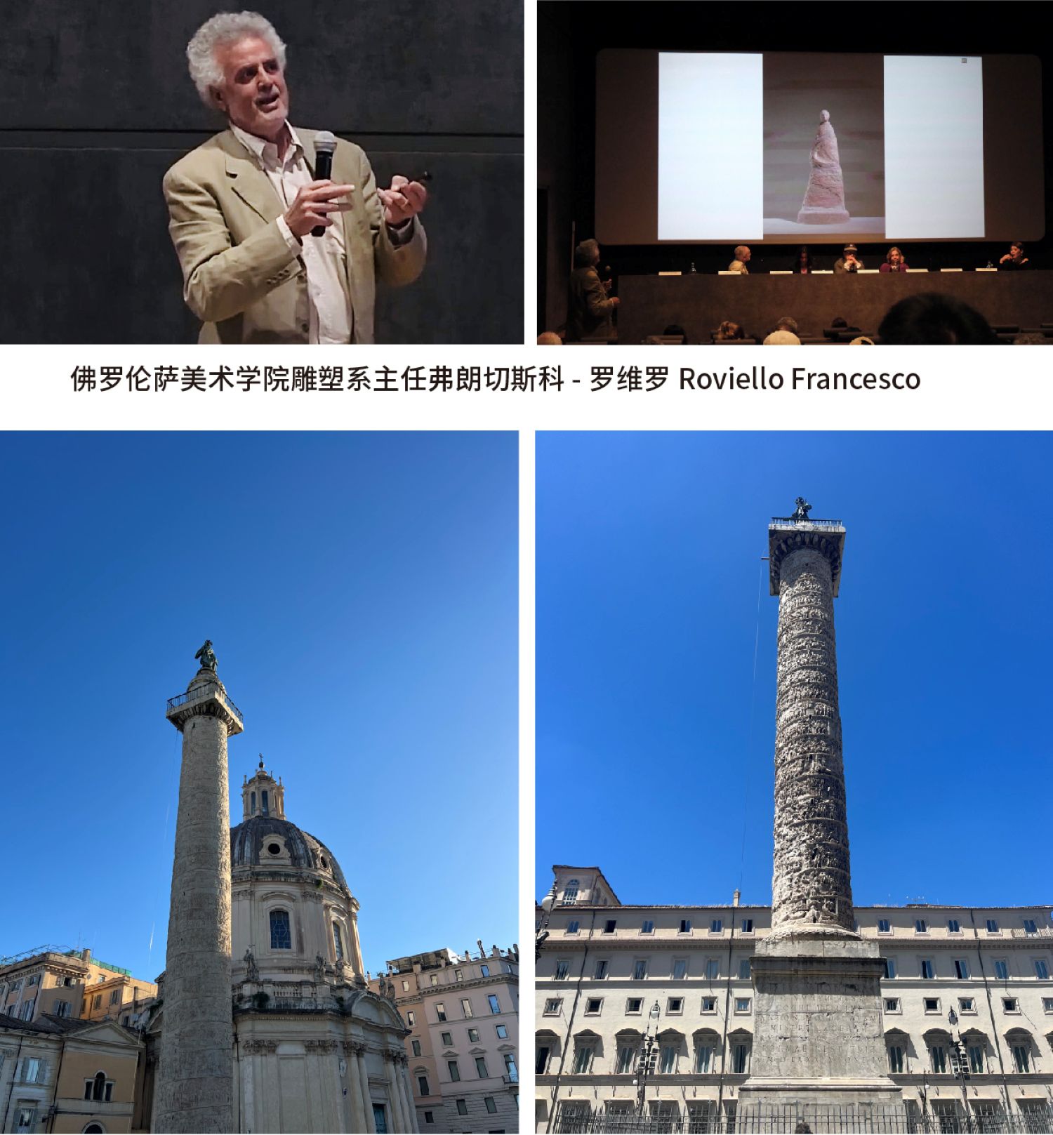 佛罗伦萨美术学院雕塑系主任弗朗切斯科-罗维罗Roviello Francesco阐述罗马三座纪念柱的建筑力学构造关系,古人的伟大智慧放在今日都没有人能够超越的这种功法。他们的学术研究非常细致,从这里可以呈现出意大利人,特别是雕塑界的艺术家们,他们不仅仅是一个艺术家,而且还是一个对力学结构、解构能力以及工学的理解能力都相当精湛,有很深的造诣。这也是为什么罗马古柱从3000年前至今仍然屹立在整个罗马城的各个角落的一个重要原因之一,对世界的建筑发展也起到了非常重要的影响。