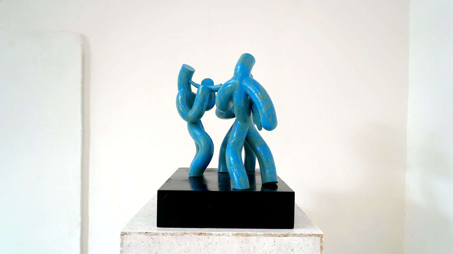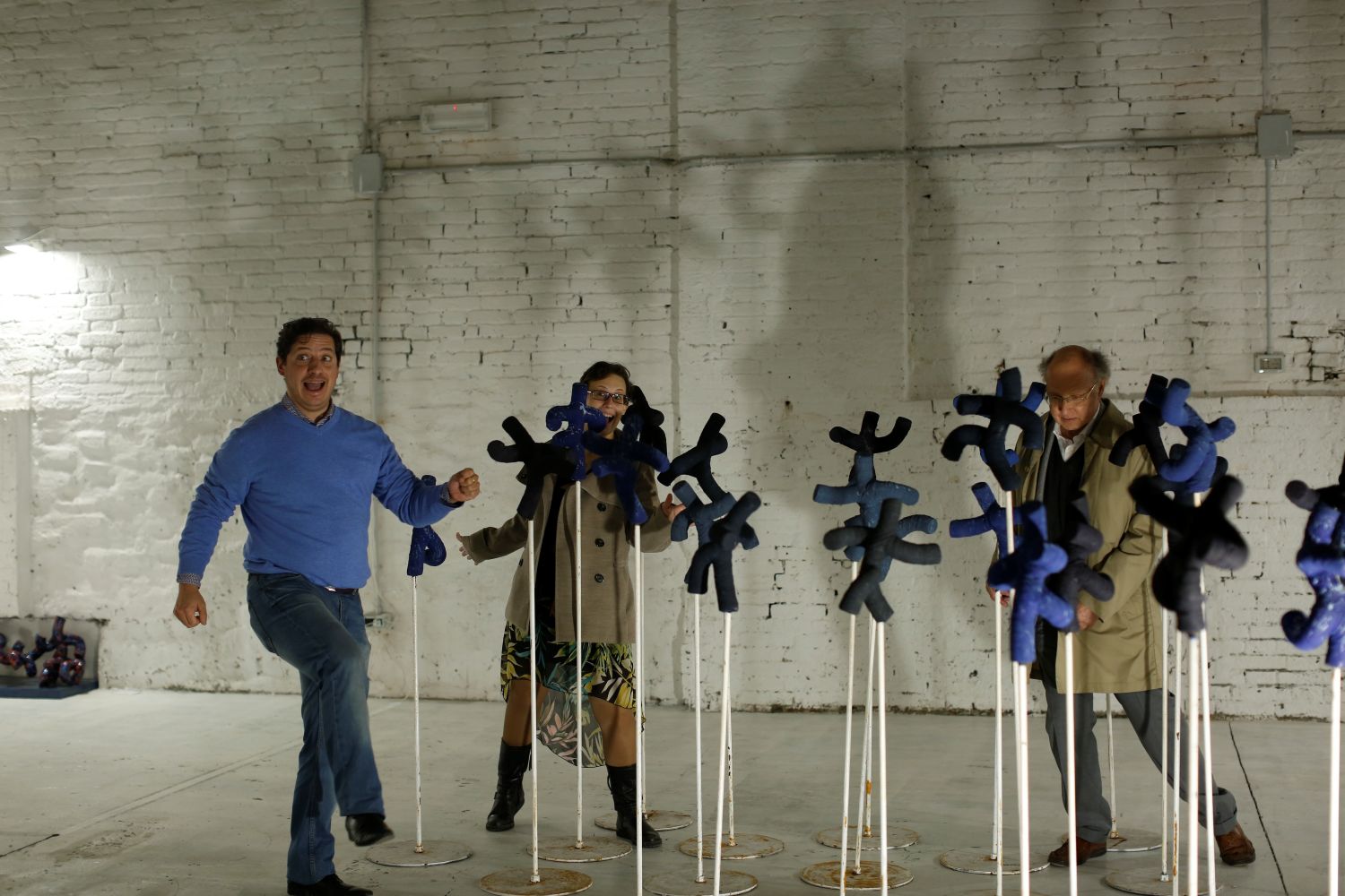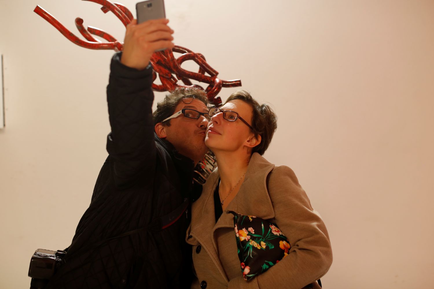 以“曾振伟的快乐人”为题,2017年10月20日-2018年1月5日,曾振伟先生的展览正式亮相威尼斯。16组“曾式快乐人”占领280平方的展厅,不同于常规架上雕塑一味置于驾上的展现方式,展览现场的作品或在墙上激昂攀爬;或从地面冲出在空中,欢乐追逐……值得一提的是,这些“曾式快乐人”较曾振伟以往的作品形态表现有所不同,他们或披上了彩色的外衣,黄的、橘红的、红的交织;蓝的、灰的、黑色交织;或被厚厚的染色的纱巾包裹。穿上了外衣的“快乐人”有了一层更晦涩的精神内涵,让观者产生疑虑:快乐真的是真正意义上的快乐吗?