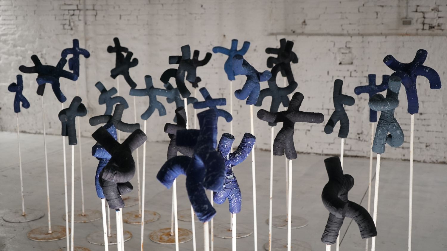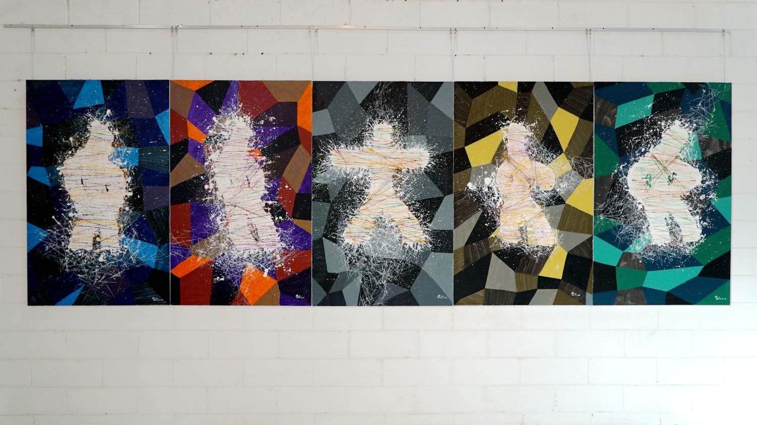 因此,我们看到了他利用自己最擅长的色彩心理学的原理,对他的“快乐人”进行了二次创作。快乐是一种很阳光的印象,他用黄色,橘红色,红色来进一步表达;表达忧郁的快乐,他选择一种沉闷的,偏冷色的蓝、灰、黑色这样的色彩来演绎。通过运用色彩,更加直白地与观者进行情绪与情感的交融。这些作品都在进一步地告知观者,表现的快乐其实包含着另一层意义。而纱布的运用,则是巧妙地借用了纱布本身所具有的伤痛、包扎等具有疼痛与病理的因素,隐喻的方式阐述快乐背后的不快乐的思维哲理。