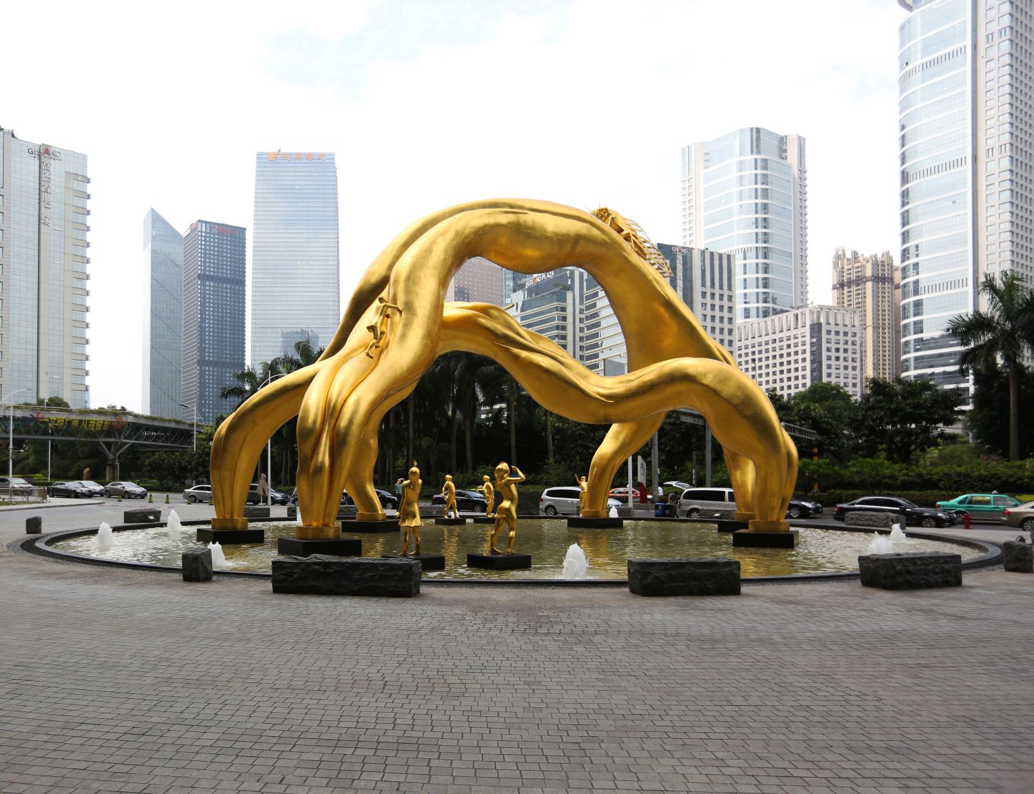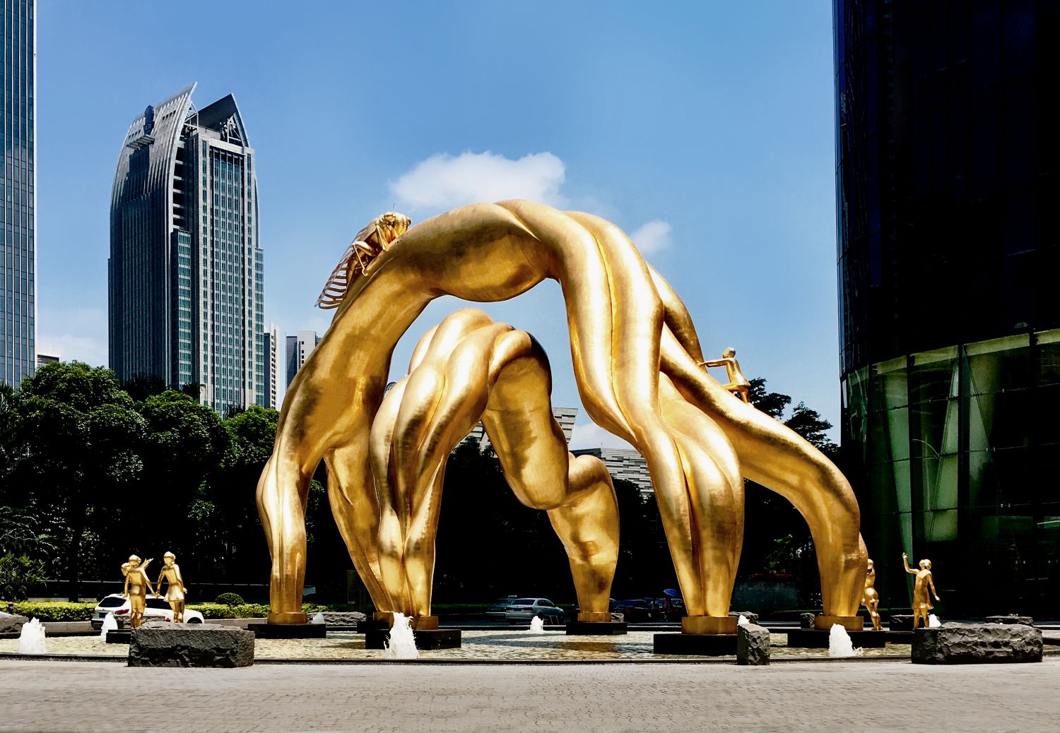 在古希腊时期,只有伟大的文化和艺术家才能创造公共艺术。因为它是文化特征传播中最重要的元素,艺术的公共性在于其传播性和渗透力。在珠江新城西塔外,我有一座大型雕塑金色的“未来之门”作品,由一只巨大的蝉、飘带及小孩们组成。金蝉在发音上接近“金钱”,寓意“金融中心”;蝉的鸣叫是非常准时的,寓意“信用”;小孩捕蝉,是许多人的童年回忆,能引发民间共鸣,攀爬也寓意着一种“冒险”精神。即使完全不懂背后深意,单纯看这种灵动的造型,也让人兴味盎然。