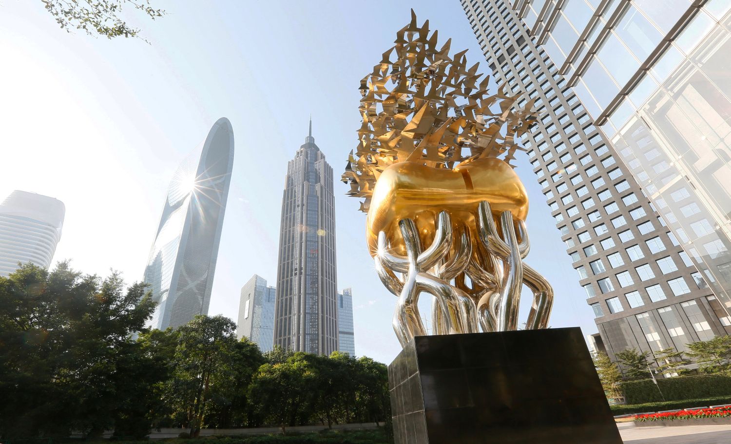 曾振伟的大型作品在珠江新城核心区广泛分布,包括广州国际金融中心的《未来之门》、广州环贸中心的《拥抱世界》和《出水芙蓉》、广州越秀金融大厦《百鸟归巢》《鳌鱼舞》《风之语》,这些公共作品已经成为羊城的文化坐标和打卡网红地。
