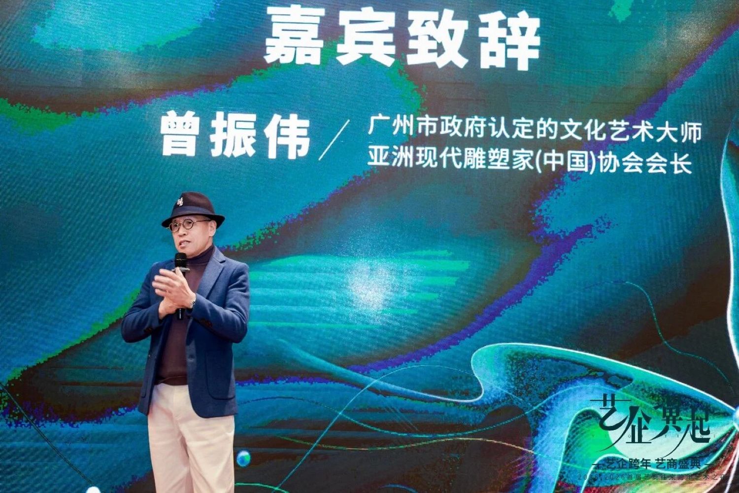 作为艺术家代表,广州市政府认定文化艺术大师、亚洲现代雕塑家(中国)协会会长曾振伟教授登台致辞,结合其创作的珠江新城地标作品《未来之门》等实践案例,深刻阐述公共艺术与城市商业空间的内在关联。他强调:“优质艺术能够激活城市空间、提升商业价值。艺术不应局限于美术馆,更应融入商业场景、走进日常生活。‘艺企跨年’搭建了艺术与商业对接的优质桥梁,让艺术家的创造力直接服务于商业品牌,实现从‘美化环境’到‘赋能品牌’的核心升级。”曾振伟教授进一步指出,未来需以传统文化美学内涵为根基,用现代思维构建中国特色新美学观,助力中国美学走向世界、让中国之美传遍全球。